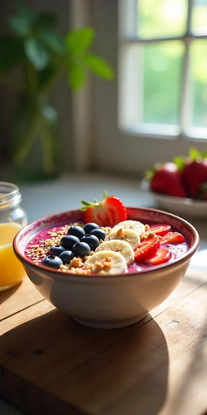 Accai, Strawberries, Granola, Blueberries, Banana, hemp seeds, honey drizzle