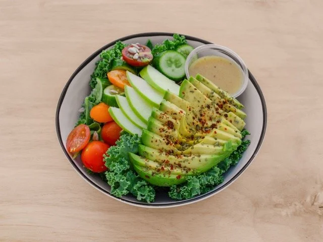Fresh kale, cherry tomatoes, persian cucumbers, granny smith apples, caramelized walnuts avocado slices, topped with homemade honey dijon vinaigrette