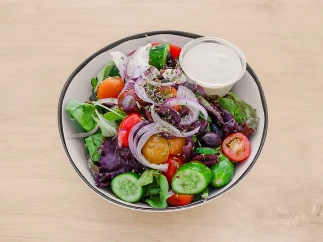 Mix greens, cherry tomatoes, persian cucumbers, kalamata olives, celery, topped with homemade tahini hummus dressing