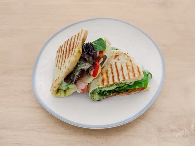 Grilled chicken, mozzarella, tomatoes, arugula, homemade pesto on panini