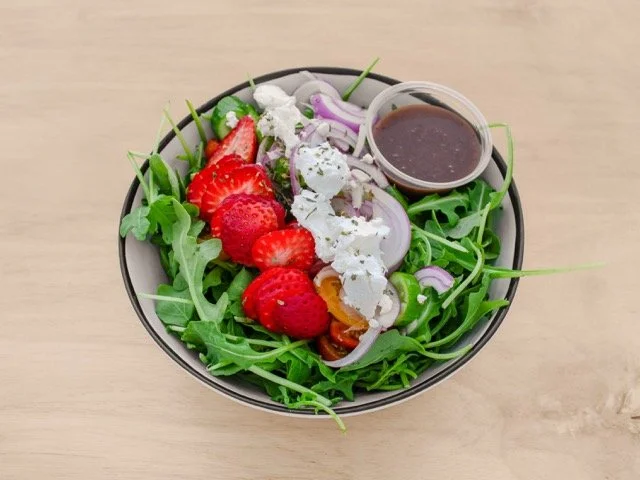 Arugula, red onions, Persian cucumbers, parsley, seasonal berries, mozzarella sunflower seeds, topped with homemade balsamic vinaigrette